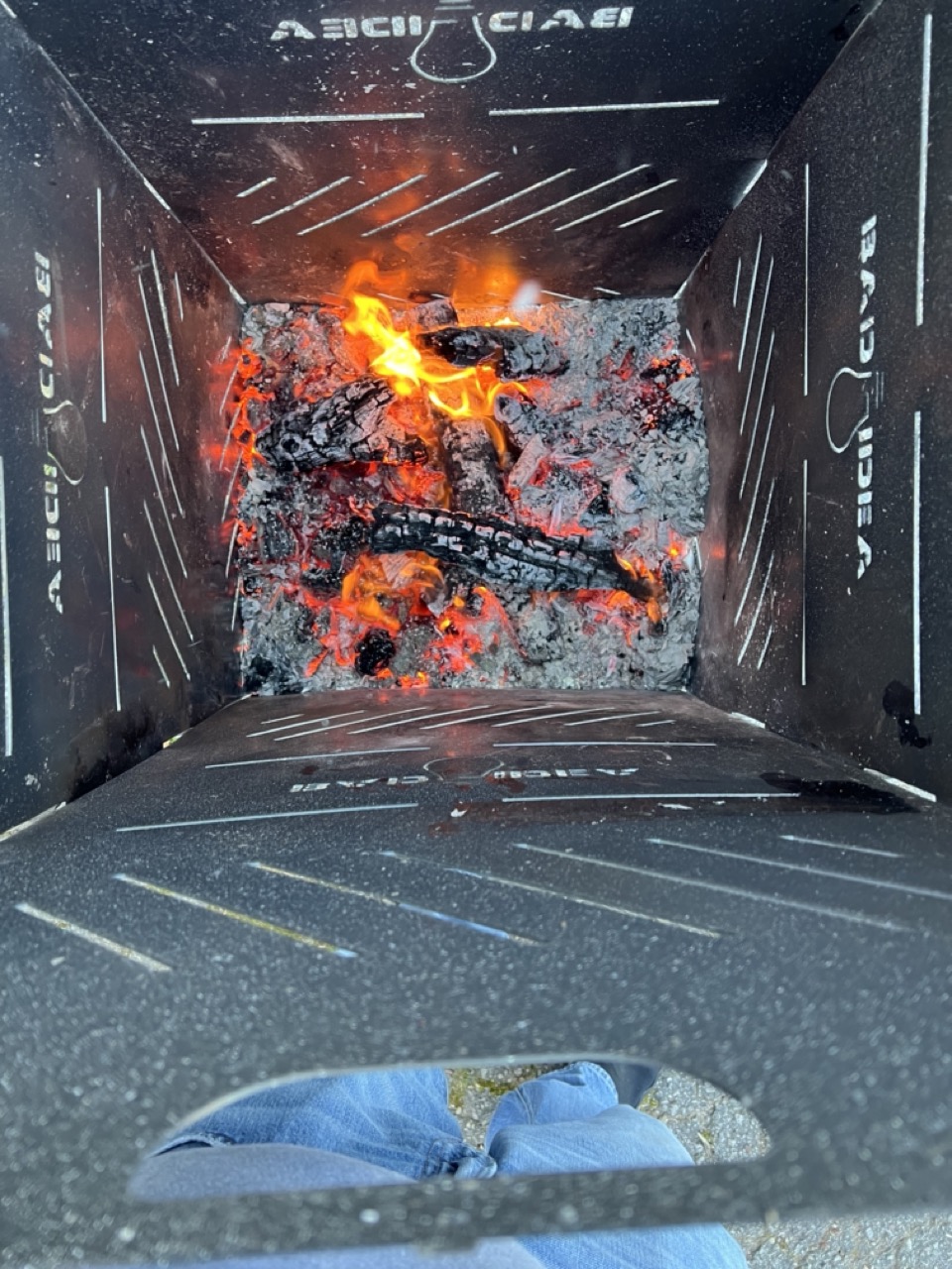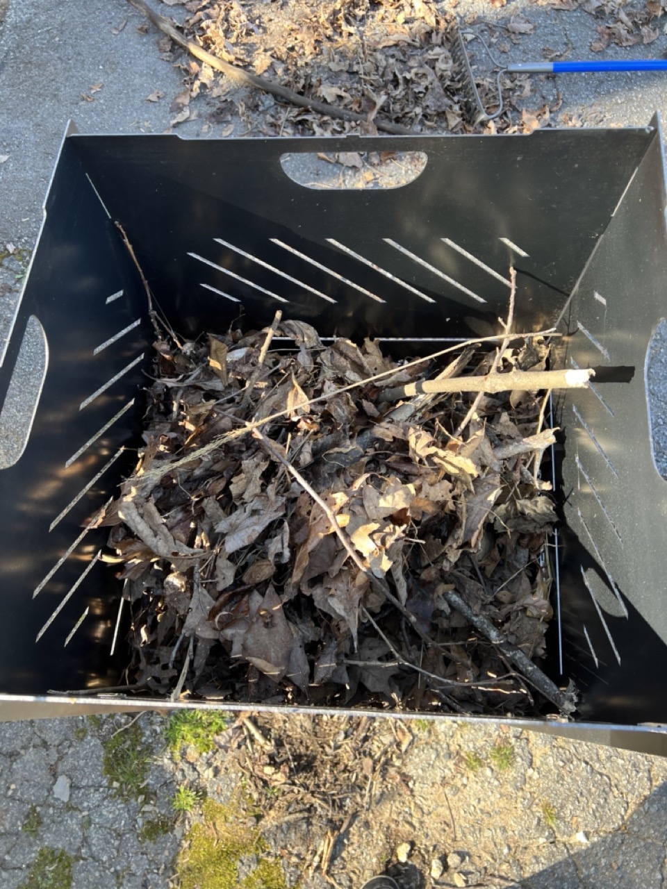 The cage was stuffed full of leaves and as many limbs as I could for the initial burn. I lit a few of the leaves that were on top and once I saw it going, I put the lid on, hoping for the best – I was not disappointed!!