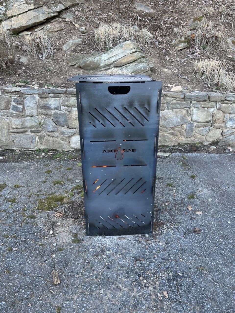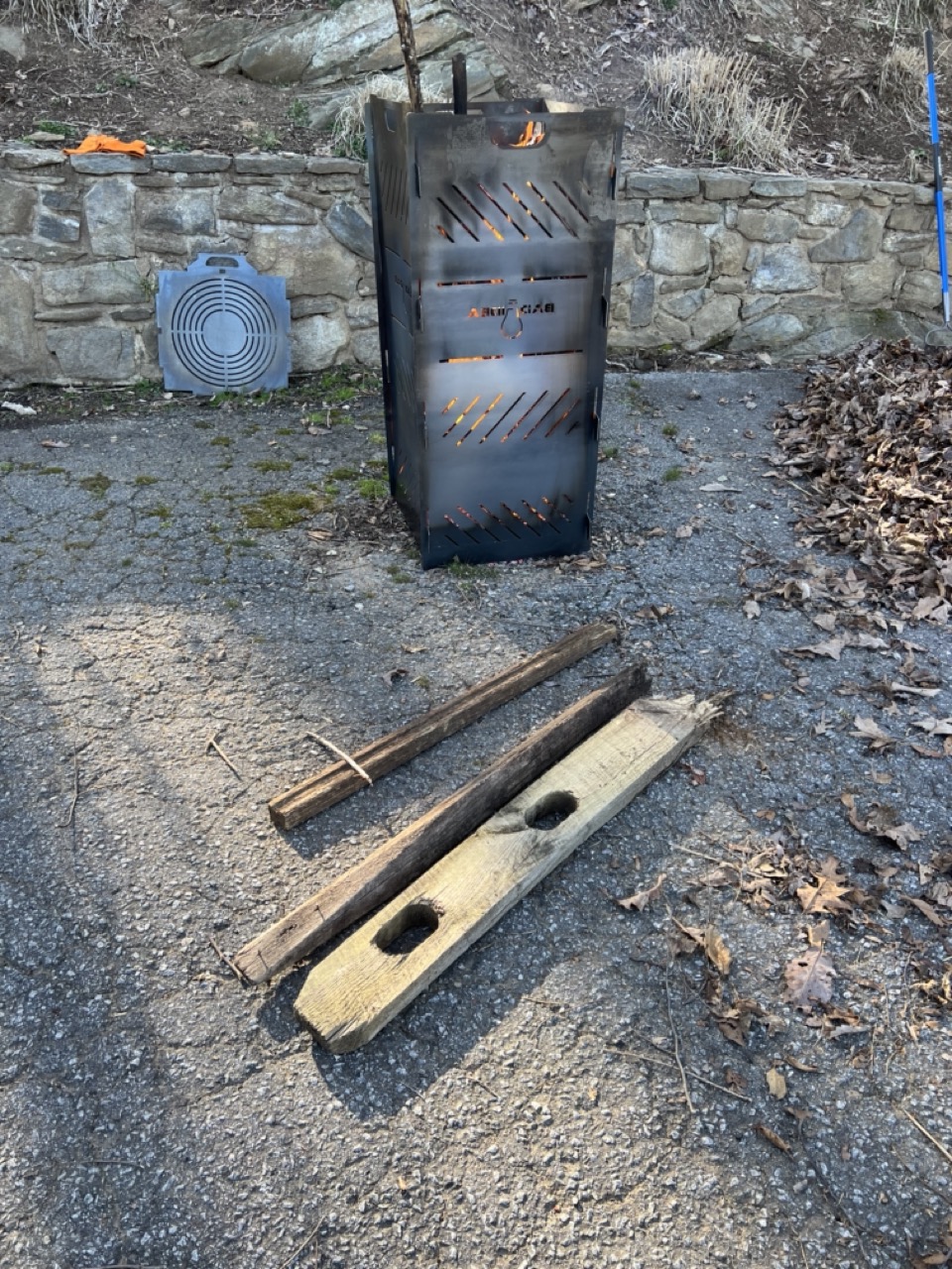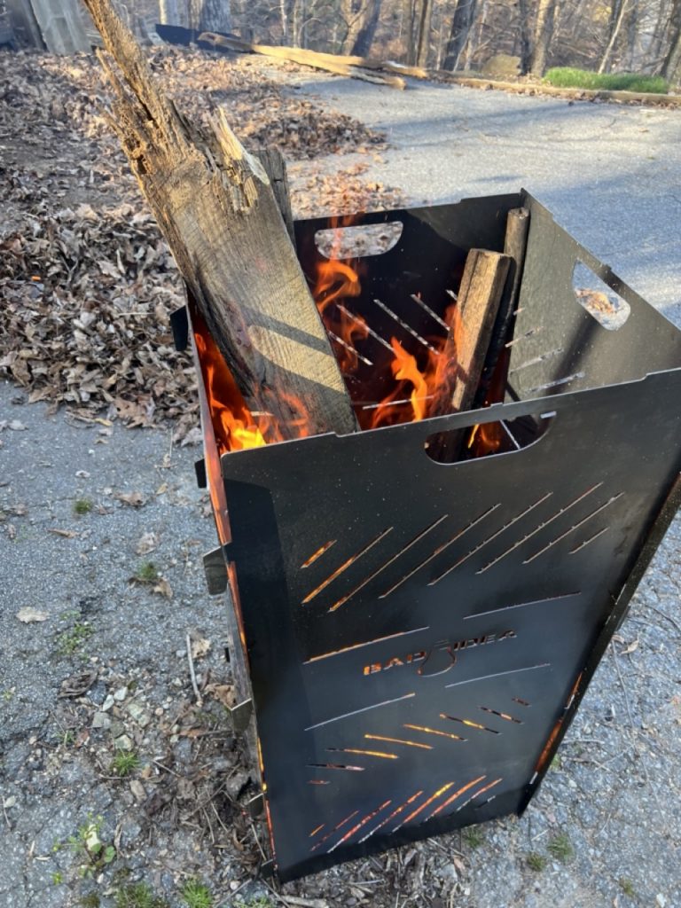 Then one day, fate stepped in – meaning, my wife backed into my overworked little steel burn machine and completely snapped off one of the three support legs. A tripod with two legs doesn’t stand very well, and it’s even harder to burn fires at such a drastic angle. So now, it’s propped up on rocks as I continue to process the ever-accumulating debris. She looked at me with sad eyes and told me to just buy the Pyro Cage now, she had a different birthday idea anyway. Well, if that’s what the wife wants, that’s what she gets! 🙂