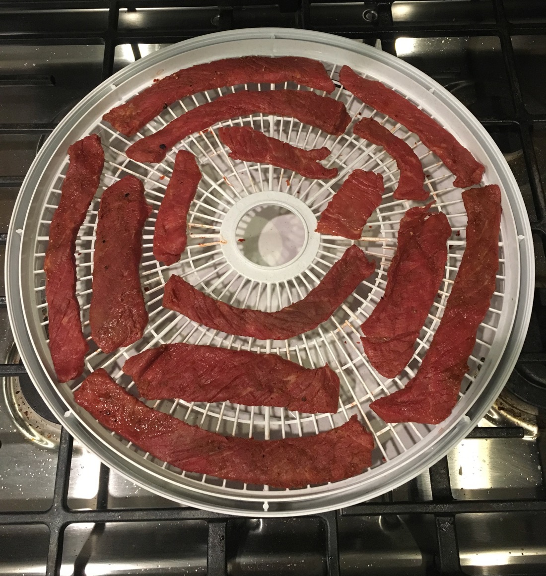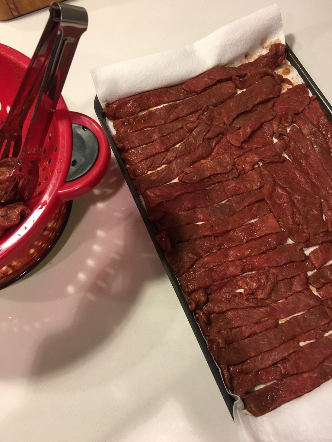 Remove strips from ziplock bag and drain excess marinade using a colander. Pat each strip dry with paper towels to more completely dry the meat