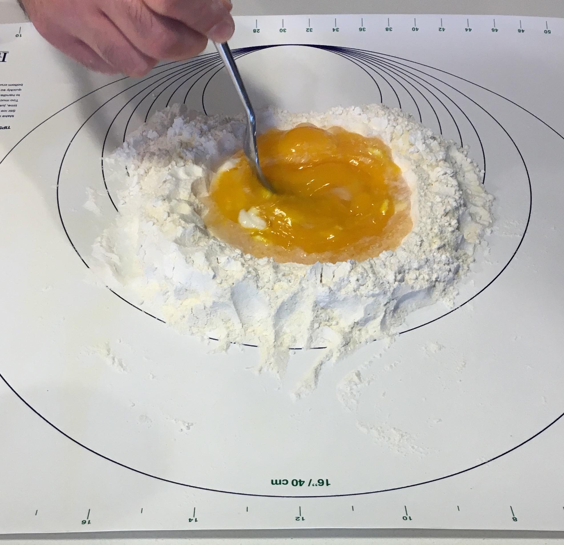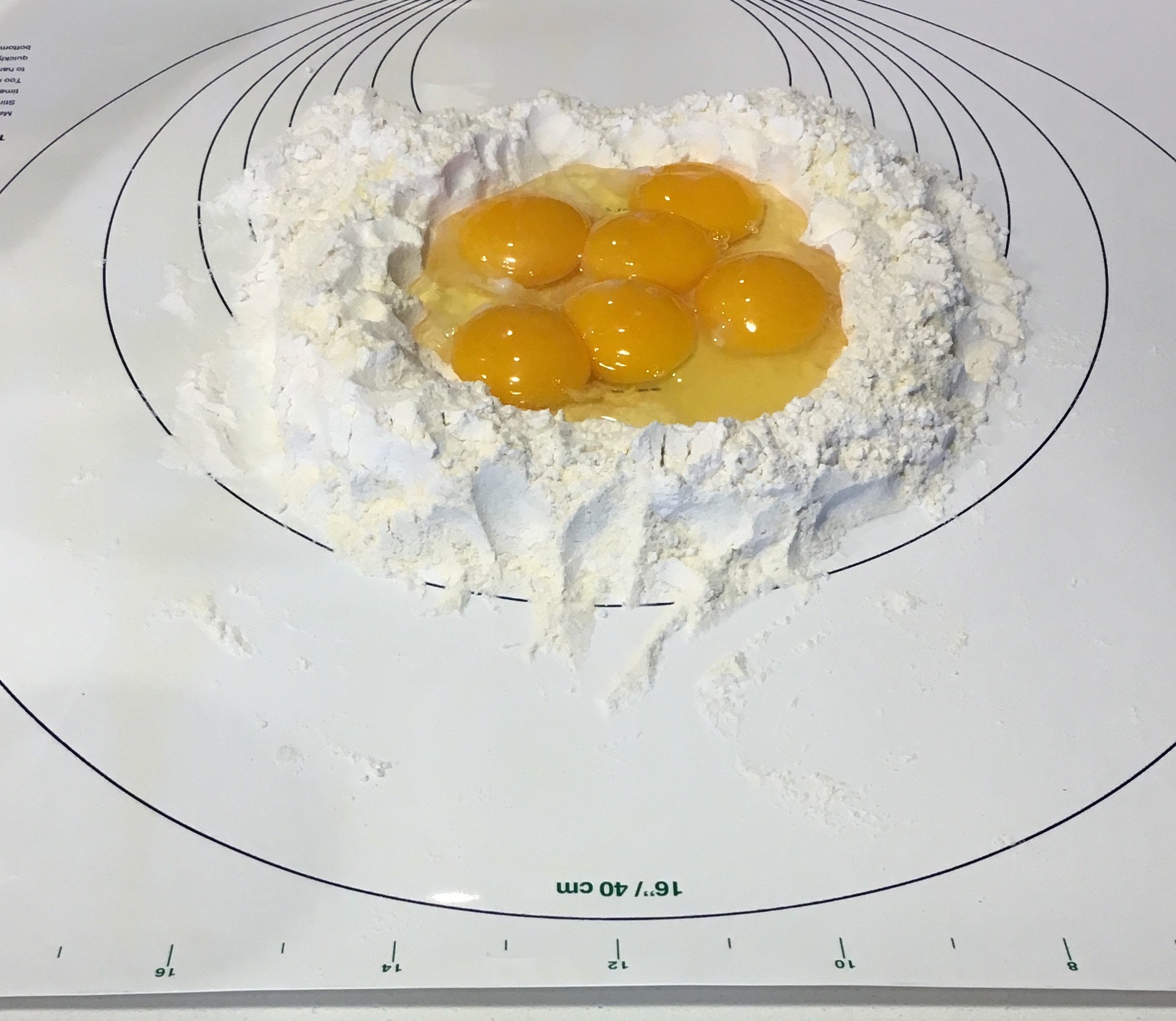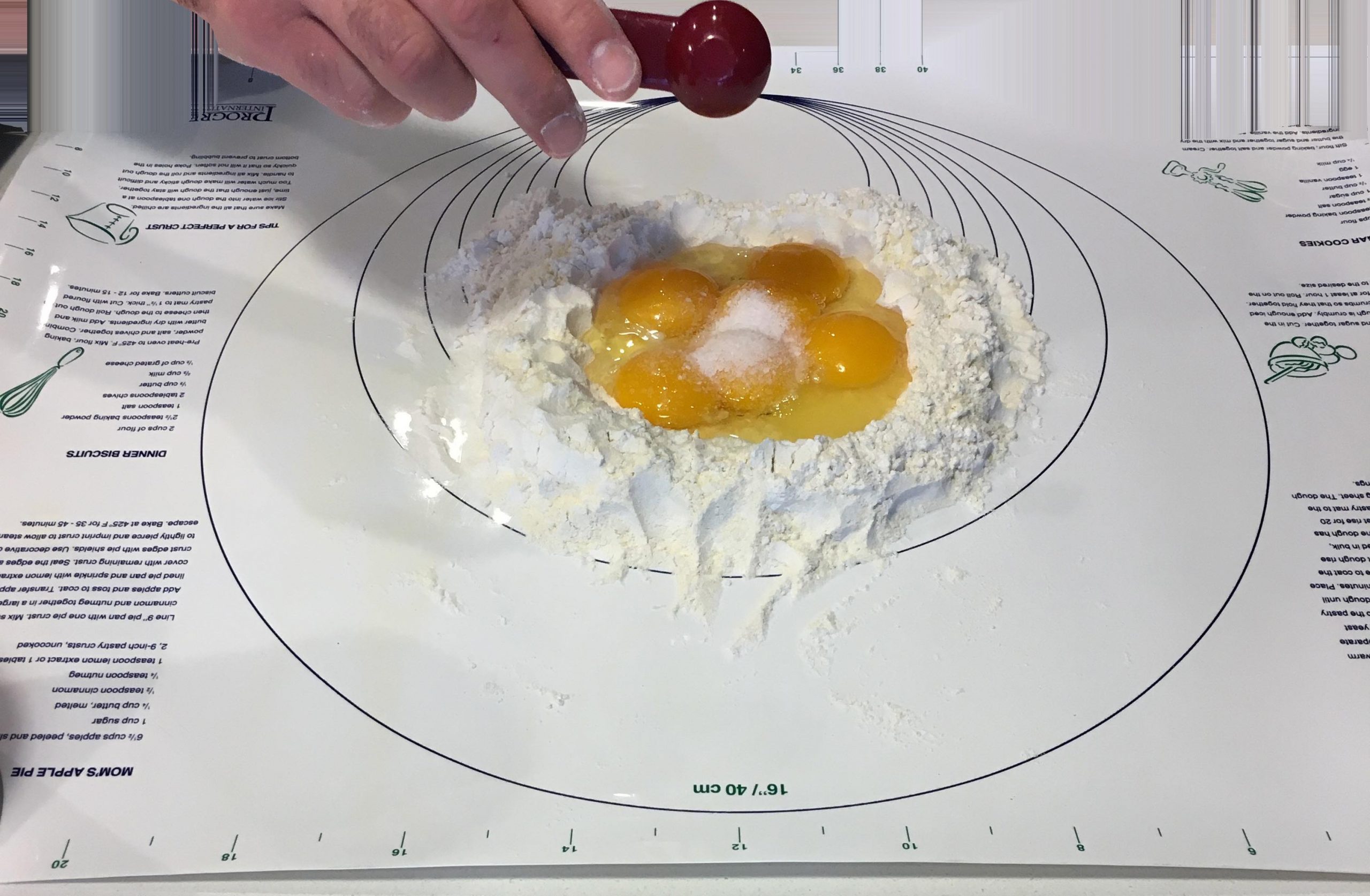 Combine the flour(s) and salt in a mound. Create a reservior to hold the eggs/yolks. Pour eggs into flour mound Whisk with a fork until the ingredients combine and start to clump Knead dough about 10 minutes and form into a ball. Wrap ball in plastic and refrigerate for about 20 minutes. Remove from refrigerator, remove plastic wrap, and briefly knead the dough and reform into a ball. At this point, you may quarter the dough ball and process through your pasta machine to create the desired type of noodle or sheet. After creating your pasta shape of choice, you want to hang or lay it out to dry. Like this whole process, you have a lot of latitude in how you do this - the recommended method would be to hang each noodle using a pasta tree (a clothes hanger works great as a cheap DIY solution), but you can also lay it out on towels, a floured baking sheet, or cookie drying rack. To cook, bring a large pot of salted water to a boil, add a little cooking oil, and drop your noodles for generally 5-10 minutes, depending on the thickness of your noodle. (If you are making lasagna, there is no pre-cooked required for homemade pasta)