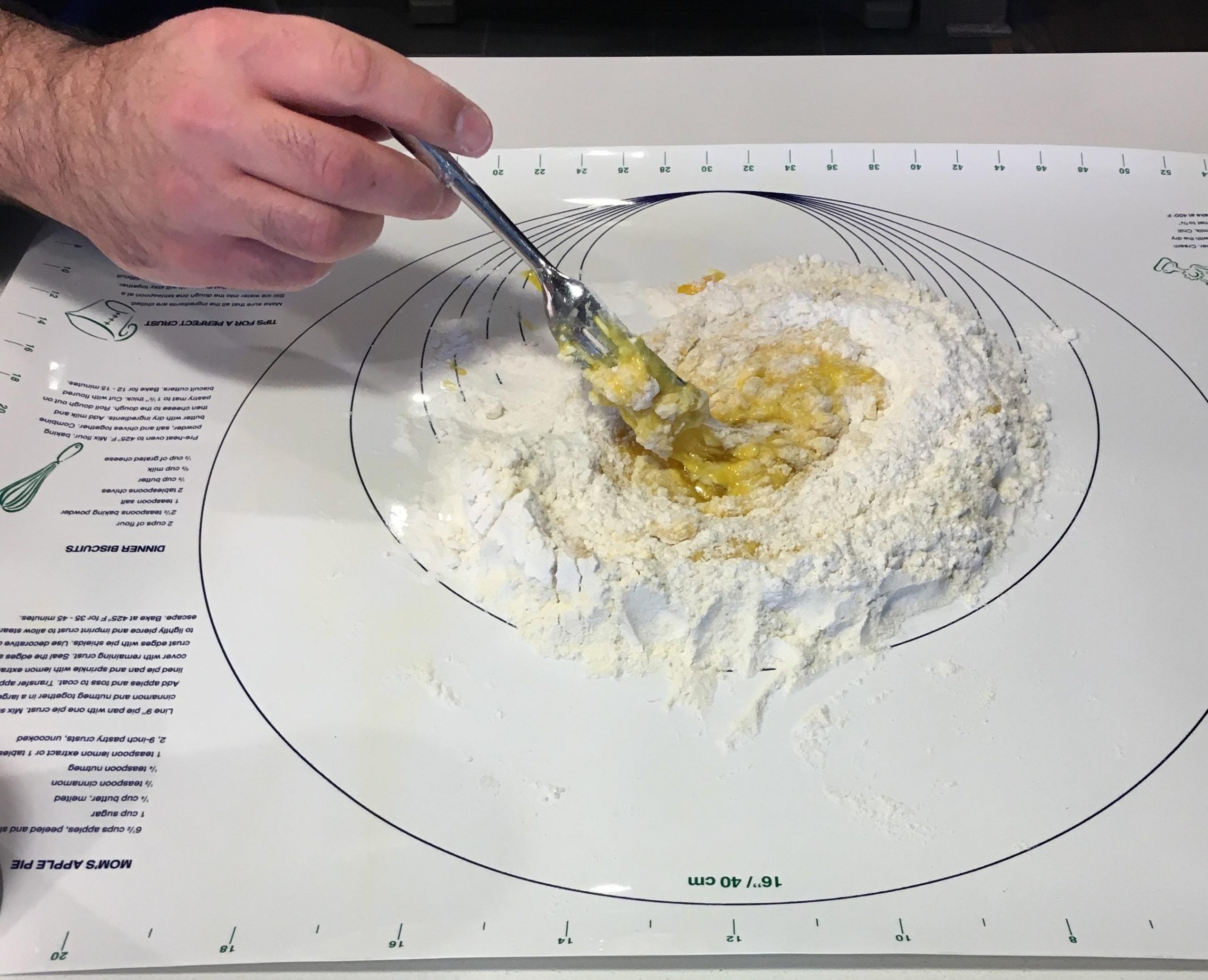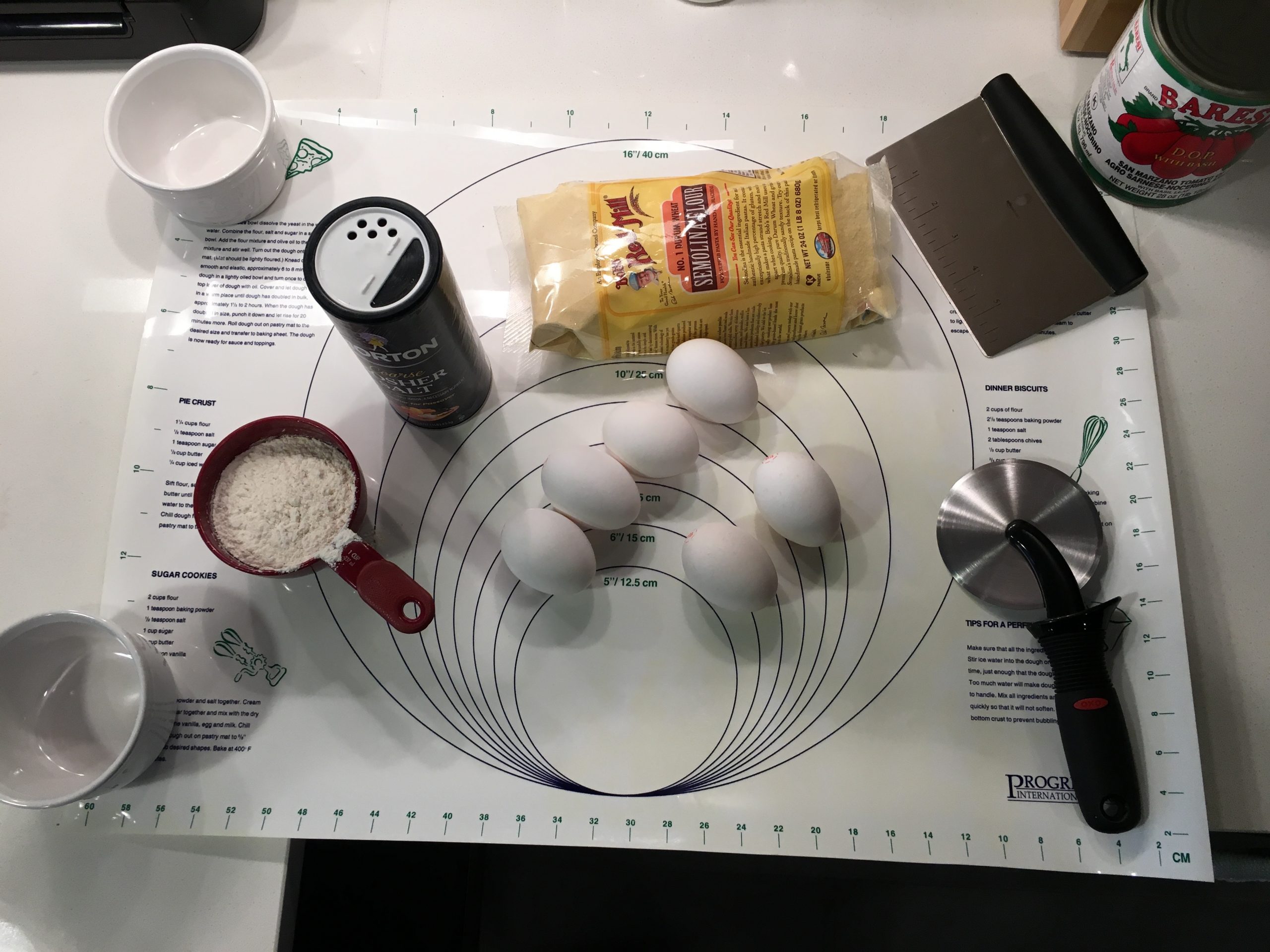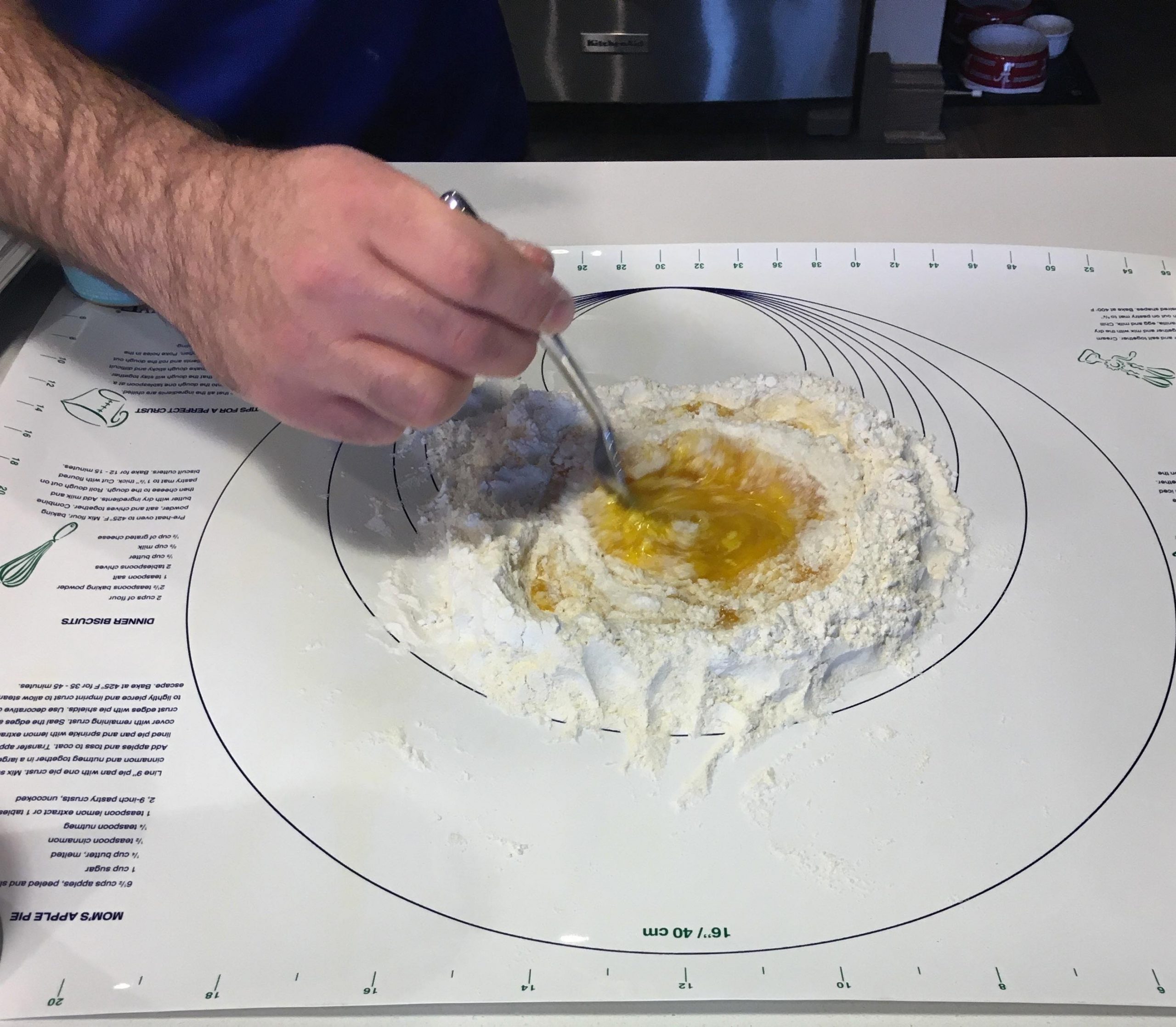Combine the flour(s) and salt in a mound. Create a reservior to hold the eggs/yolks. Pour eggs into flour mound Whisk with a fork until the ingredients combine and start to clump Knead dough about 10 minutes and form into a ball. Wrap ball in plastic and refrigerate for about 20 minutes. Remove from refrigerator, remove plastic wrap, and briefly knead the dough and reform into a ball. At this point, you may quarter the dough ball and process through your pasta machine to create the desired type of noodle or sheet. After creating your pasta shape of choice, you want to hang or lay it out to dry. Like this whole process, you have a lot of latitude in how you do this - the recommended method would be to hang each noodle using a pasta tree (a clothes hanger works great as a cheap DIY solution), but you can also lay it out on towels, a floured baking sheet, or cookie drying rack. To cook, bring a large pot of salted water to a boil, add a little cooking oil, and drop your noodles for generally 5-10 minutes, depending on the thickness of your noodle. (If you are making lasagna, there is no pre-cooked required for homemade pasta)