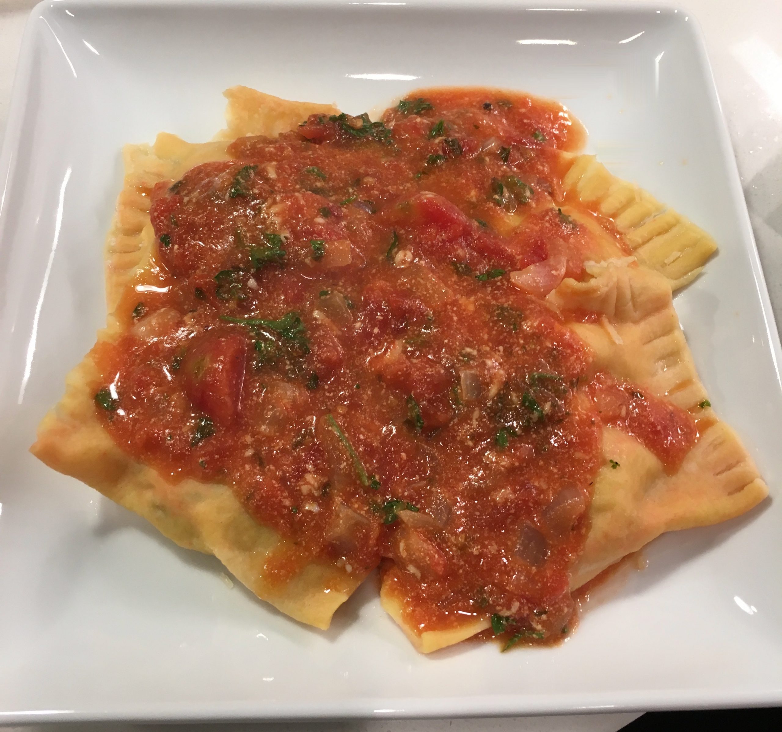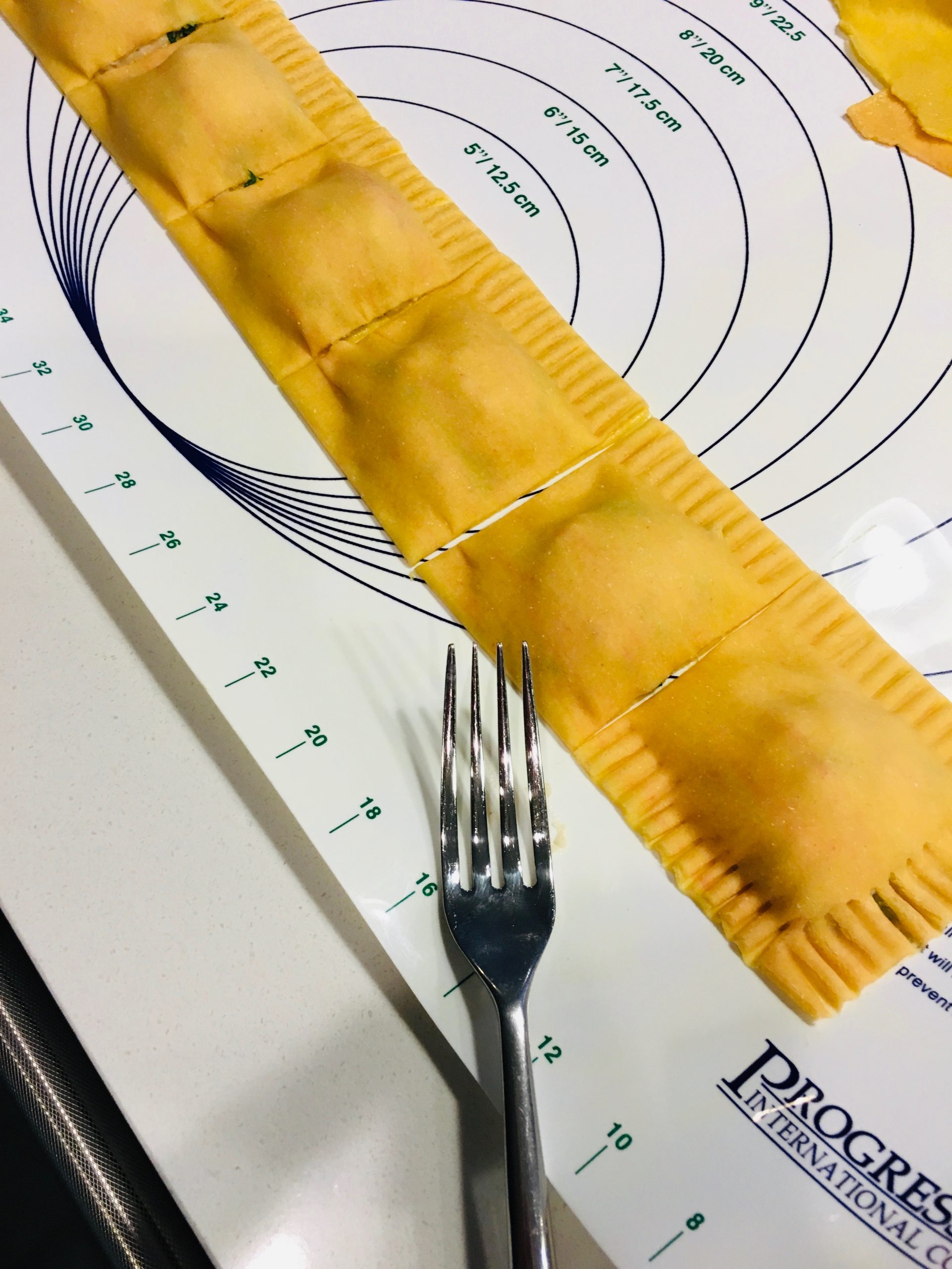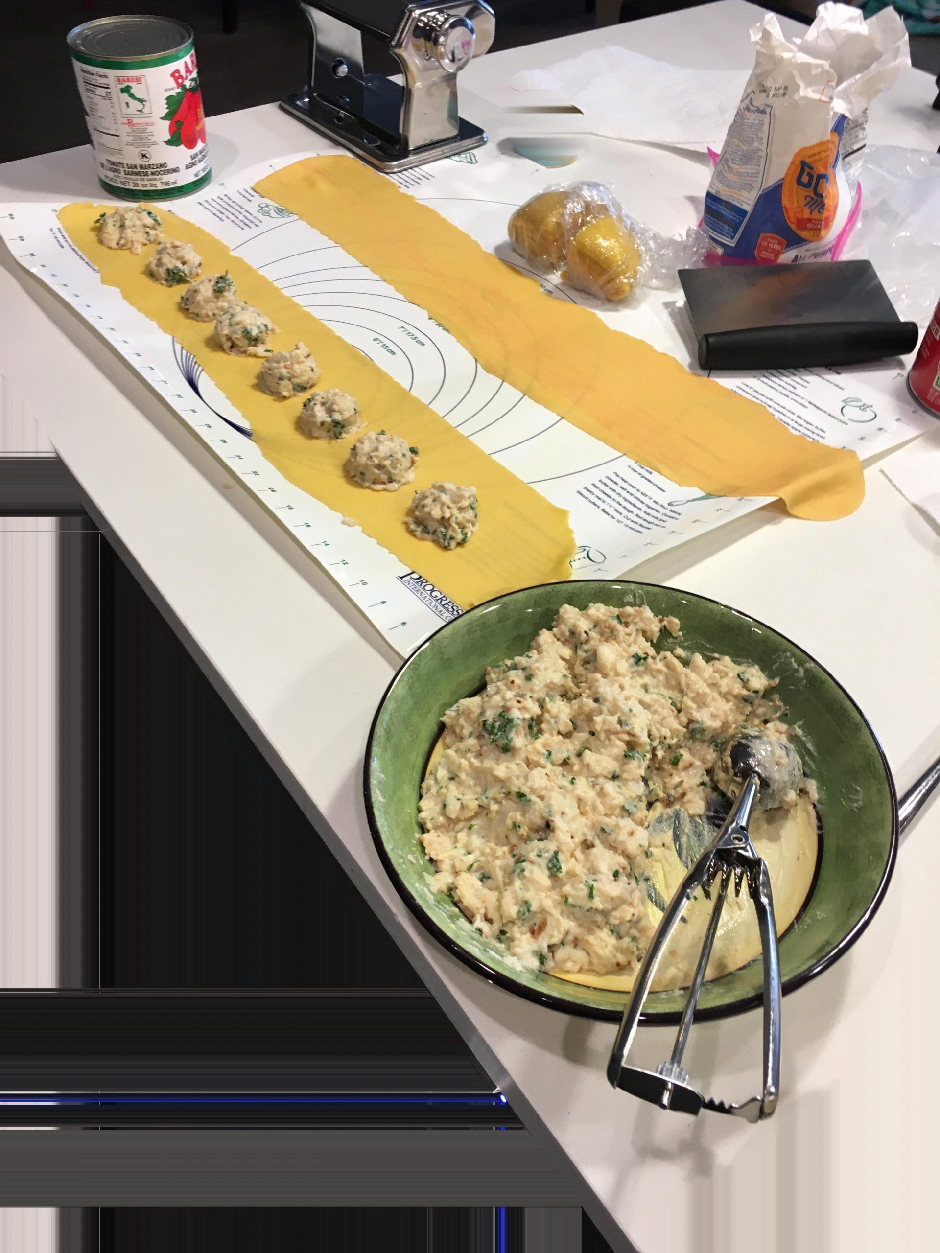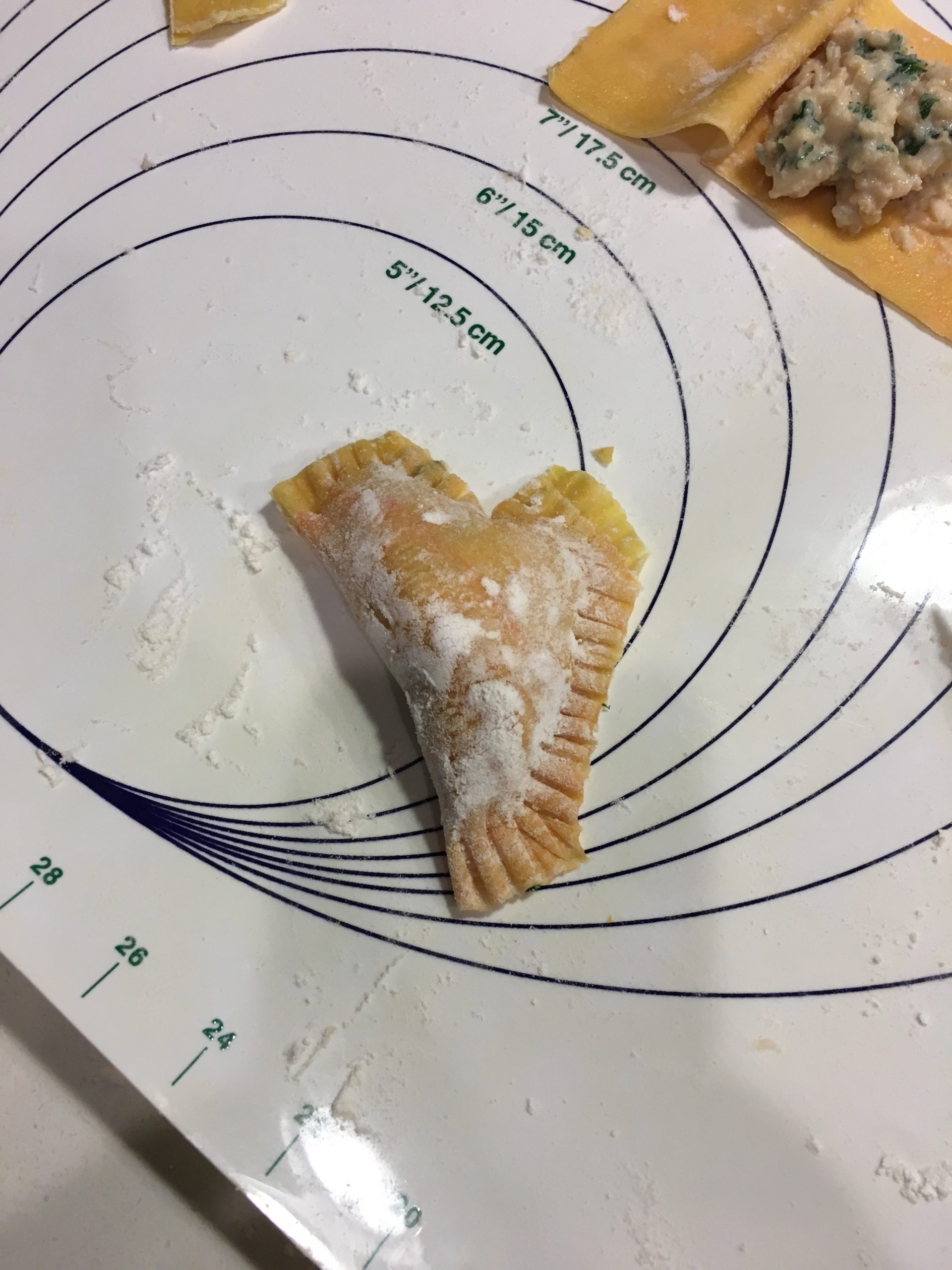 The gallery below shows more pictures of the in-between steps, as well as a finished ravioli stuffed with a sage brown butter seafood filling.
