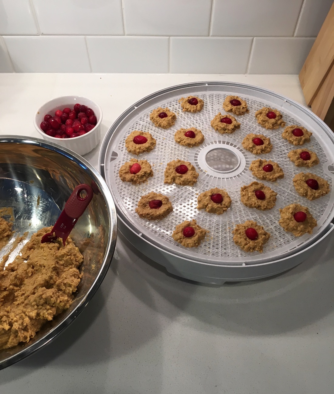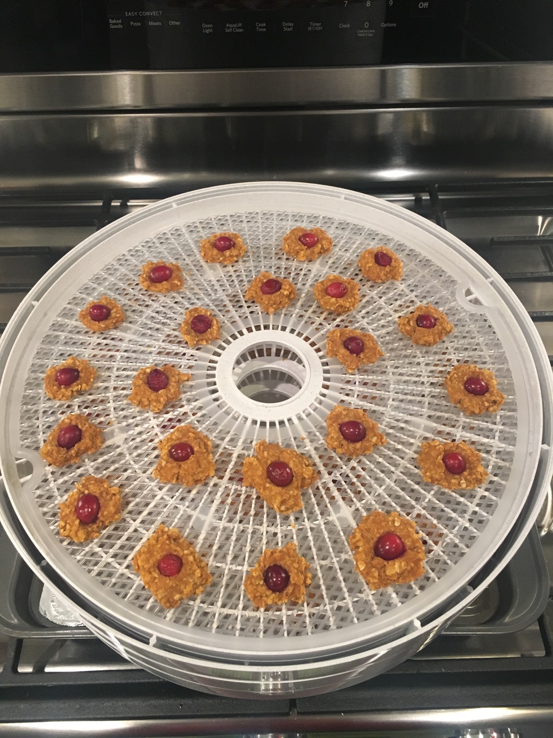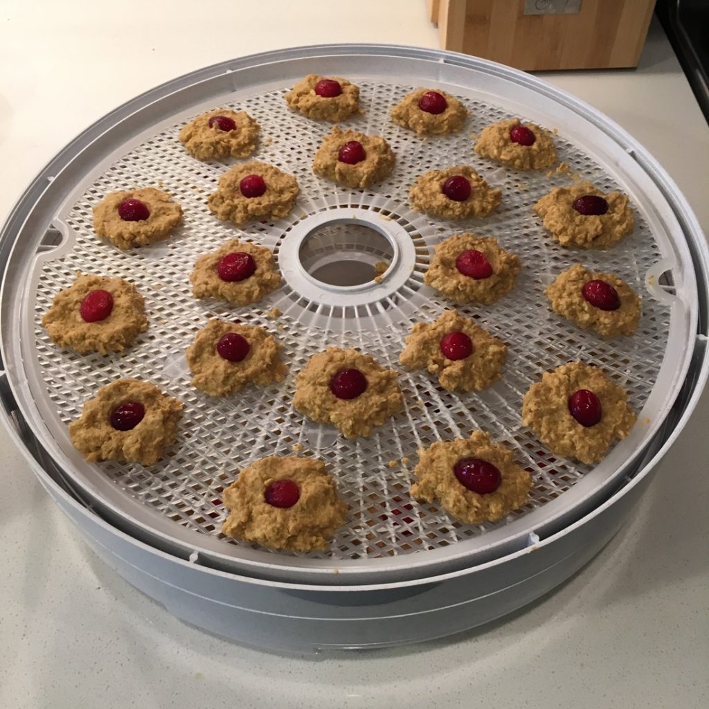 Using a small disher or teaspoon, spoon the treats onto the dehydrator racks and securely press a cranberry on top. Dehydrate at 160 degrees for 4-5 hours until dried but not crispy