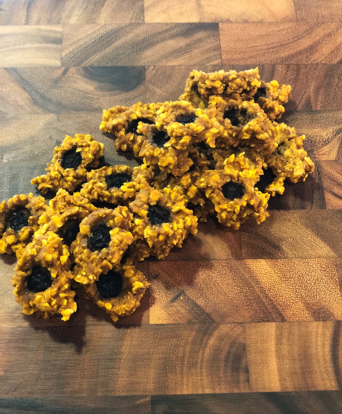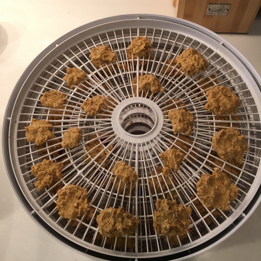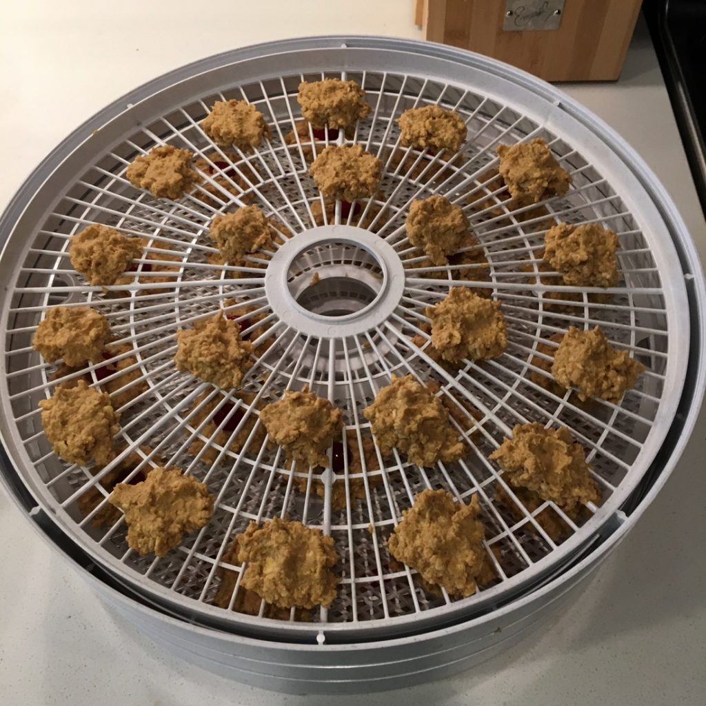 Using a small disher or teaspoon, spoon the treats onto the dehydrator racks and securely press a cranberry on top. Dehydrate at 160 degrees for 4-5 hours until dried but not crispy