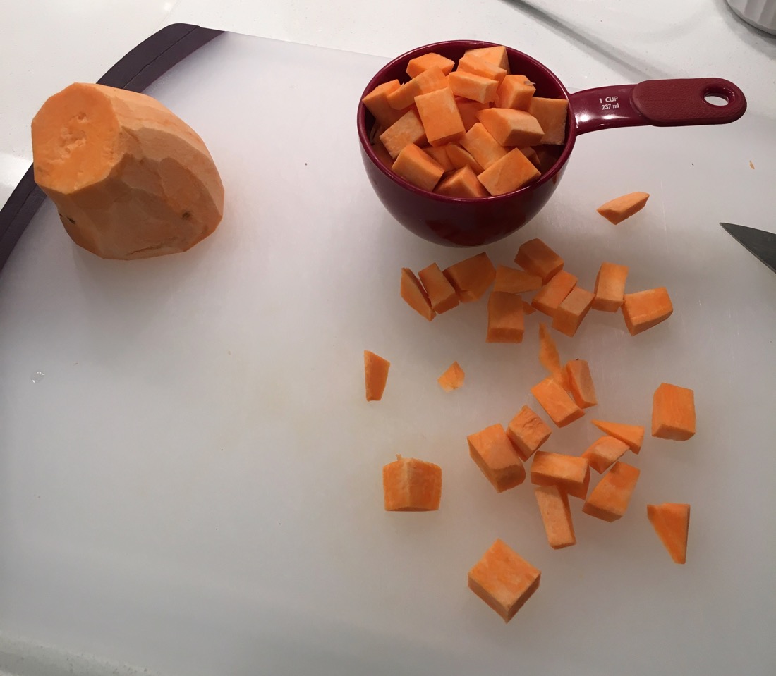 Chop sweet potato into roughly even pieces and add to a pot of boiling water, enough to cover potatoes. Boil for about about 10 minutes, until pieces are soft
